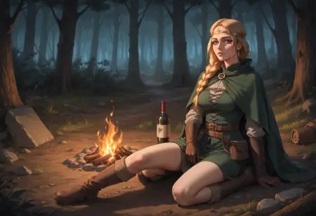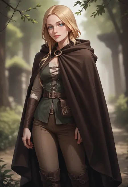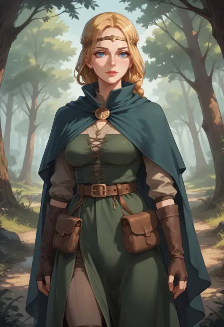 推荐标签:金色头发、发辫、头发垂肩、蓝色眼睛、胸部、珠宝、耳环、头带、长袍、头冠、袋子、手套、腰带、斗篷、靴子、箭囊,