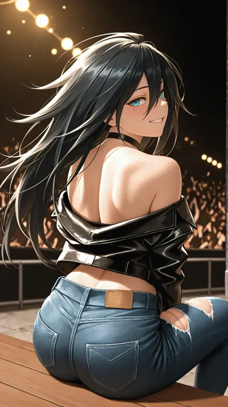 long hair, black hair, blue eyes, red mask, domino mask, mole under eye, white bodysuit, black bodysuit, red gemstones, handcuffs, garter straps, black thighhighs, red belt, hsuit1,