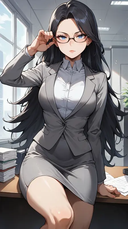 长发,黑发,蓝眼睛,眼下痣,眼镜,灰色西装,白色领衬衫,灰色裙子,铅笔裙,osuit6,