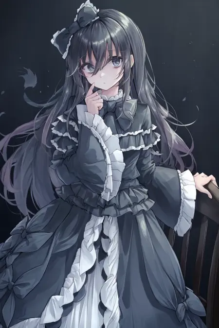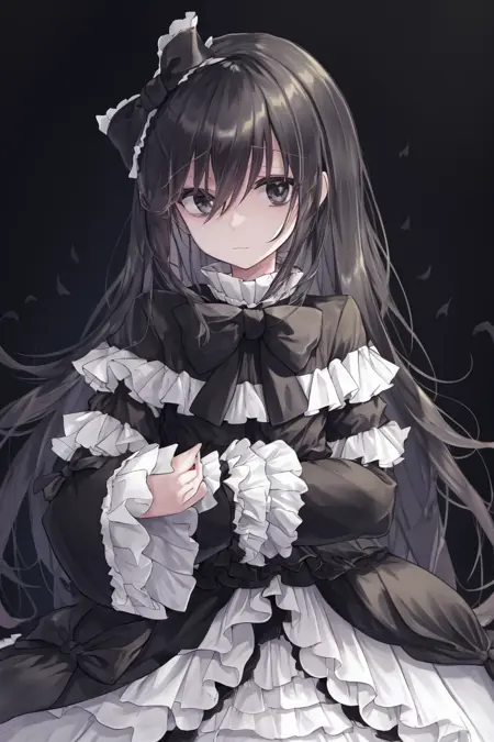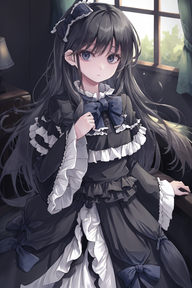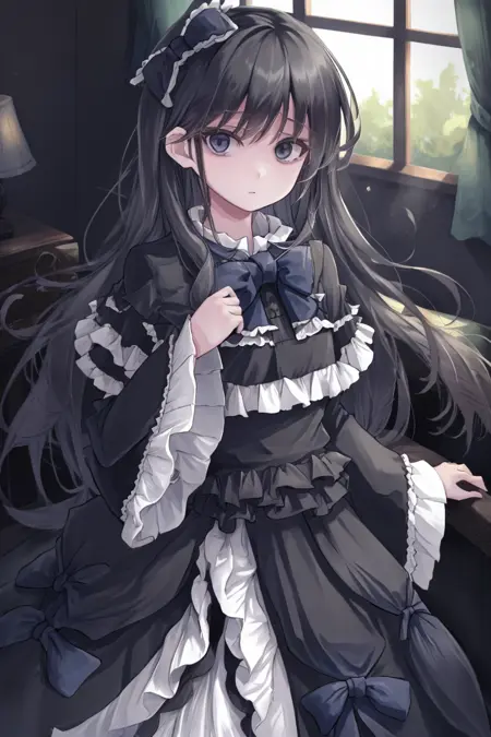 提示:ghost belle,头发遮住眼睛,长发及地,黑眼睛,发带,黑发,宽袖,黑色连衣裙,蓝色连衣裙,蓝色蝴蝶结,荷叶边裙子,荷叶边袖子