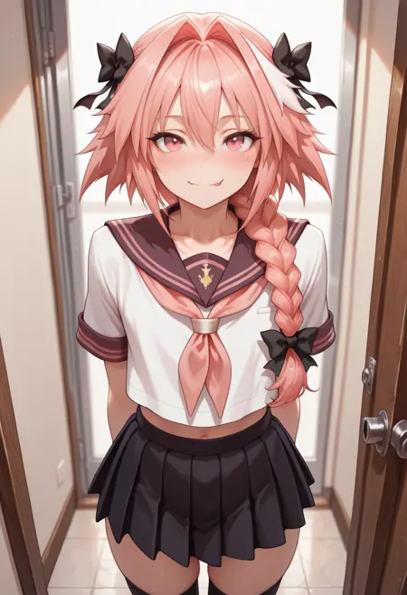 astolfo, male focus, 1boy, smile, skirt, otoko no ko, long hair, thighhighs, school uniform, braid, solo, looking at viewer, hair intakes, serafuku, navel, sailor collar, bow, pink skirt, white thighhighs, crop top, short sleeves, hair bow