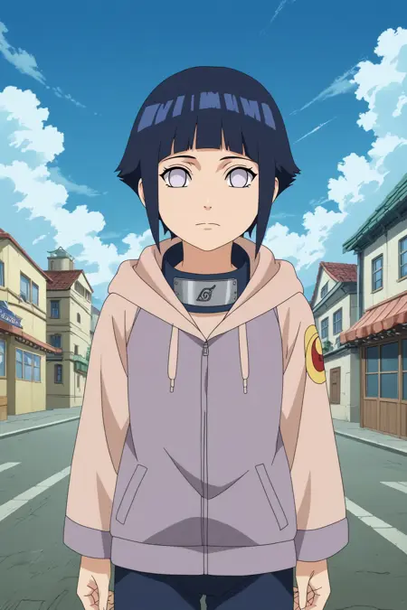 트리거: hinata,1girl,solo,looking_at_viewer,long hair,konohagakure_symbol, white eyes,long_sleeves, bangs,forehead protector,blunt bangs,hood,long hair,no pupils
