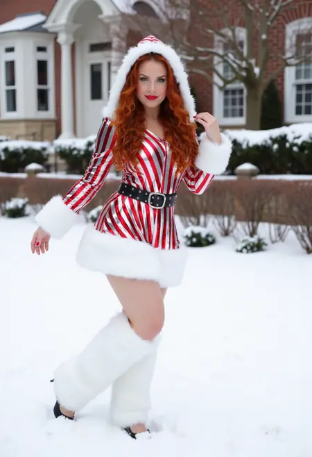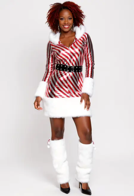 The dress is designed in a candy cane pattern with alternating red and white diagonal stripes. The top part of the dress features a shiny, metallic fabric that catches the light, giving it a reflective quality. The outfit has a deep V-neckline with a fur-trimmed hood, adding a plush, warm texture contrast to the shiny fabric. The sleeves are long and fitted, ending in white faux fur cuffs