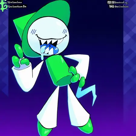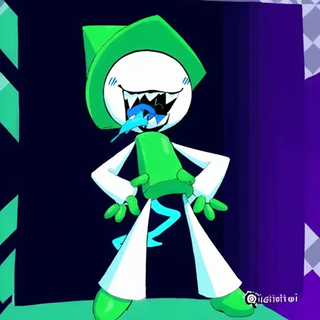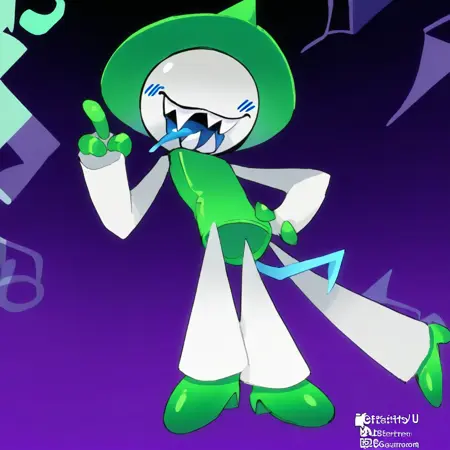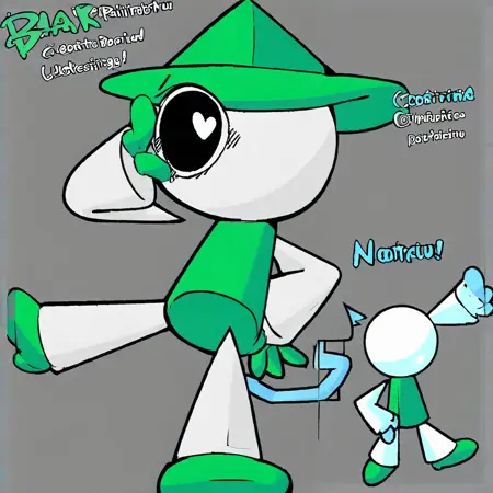 | トレーニングワード | solo, witch hat, 1boy, green shirt, long sleeves, white sleeves, white pants, bald, no hair, white skin, colored skin, green hands, green shoes, green hat, one eye, black eye, one-eyed, no mouth, mouthless, only one eye, green hat, hatコピーしました! |
