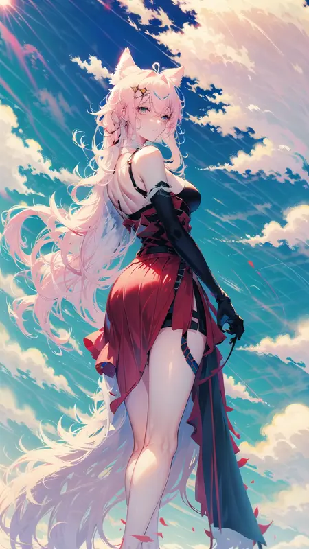 -->提示词: pozëmka&typewriter, pink eyes, wolf ears, wolf girl, animal ears, black bra, animal ear fluff, thigh strap, red skirt, underwear, high-waist skirt, pelvic curtain