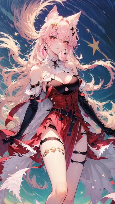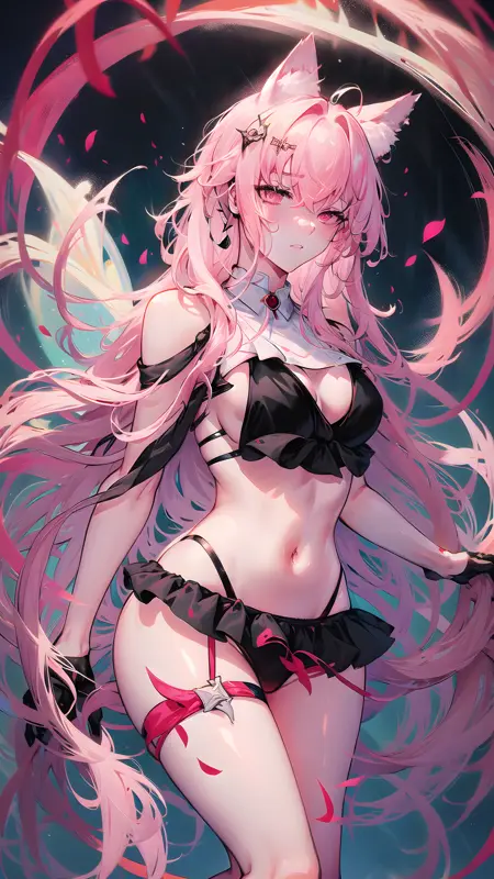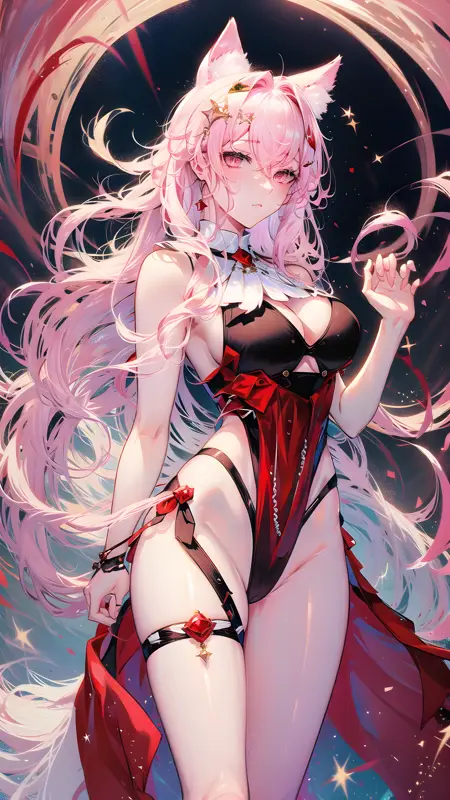 -->プロンプト:pozëmka&typewriter, pink eyes, wolf ears, wolf girl, animal ears, black bra, animal ear fluff, thigh strap, red skirt, underwear, high-waist skirt, pelvic curtain