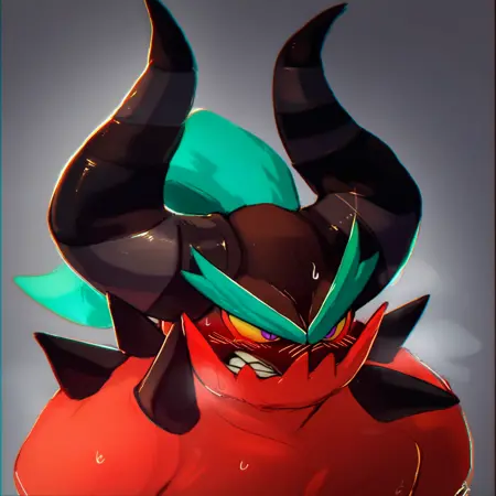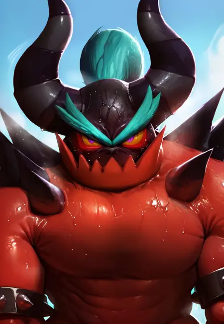 扎沃克,恶魔,单人,红色颌护甲,黄色眼白,紫色眼睛,红色眼线,条纹角,青绿色头发,青绿色眉毛,黑色尖刺手环,2个脚趾,5根手指,红色上身,黑色下身,尾巴,肌肉发达的男性