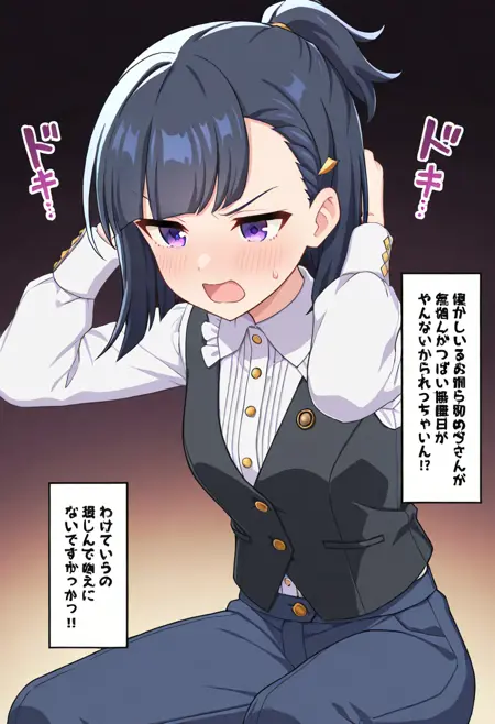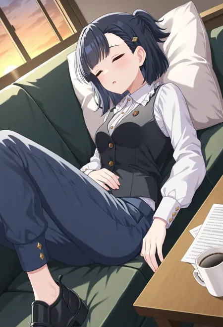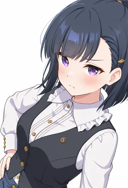 UMAKO,medium hair,black hair,asymmetrical bangs,hairclip,short ponytail,purple eyes,black vest,frilled shirt collar,collared shirt,dress shirt,long sleeves,cuff links,blue pants,shoes