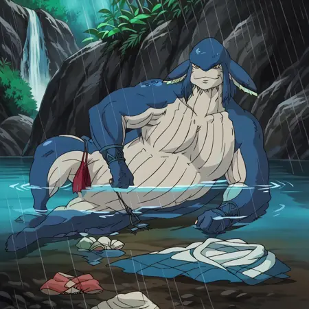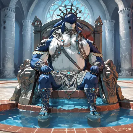 Dorephan, zora, blue skin, large male, intricate outfit, scarf, crown,