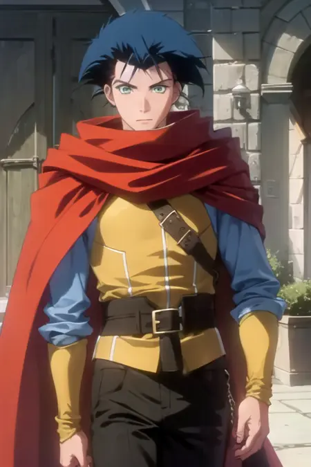 Astral, blue hair, male focus, 1boy, green eyes, red cape, armor, solo, long sleeves, short hair, scarf, black pants, yellow shirt