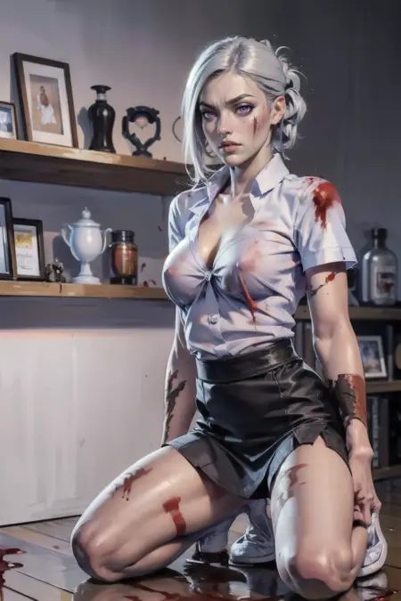 Prompt: Amily_AoV, 1girl, solo, short hair, folded ponytail, multicolored hair, bangs, grey hair, looking at viewer, purple eyes, make up, scar on face, nose, lips, parted lips, closed mouth, shoulder armor, cleavage, breasts, large breasts, scar, scar on body, dark skin, dark-skinned female, armor, clothing cutout, asymmetrical clothes, leotard, gloves, fingerless gloves, navel, navel cutout, cameltoe, thighhighs, boots, thigh boots, high heels, high heel boots, brown footwear, knife