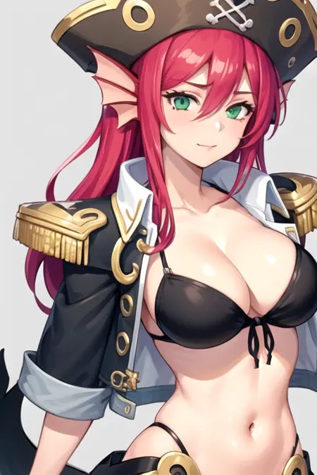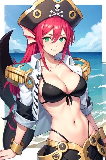 | 학습된 단어 | AnneSirena, 1girl, solo, mermaid, head fins, green eyes, large breasts, pirate hat, monster girl, long hair, cleavage, bikini top only, gills, front-tie top, pink hair, navel, black bikini, open jacket, cropped jacket, hair between eyes, midriff, red hair, epaulettes, short sleeves복사됨! |