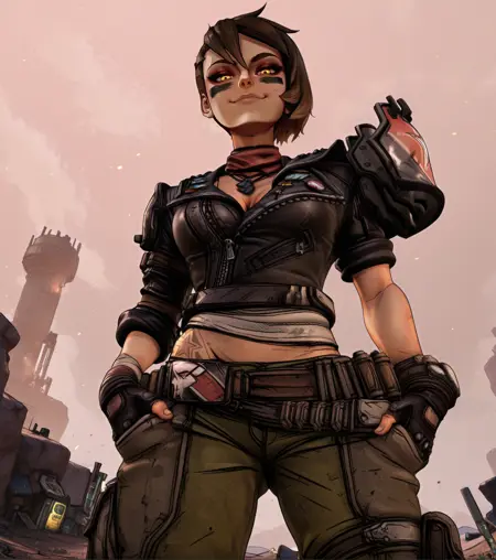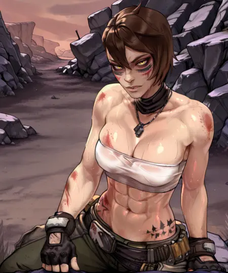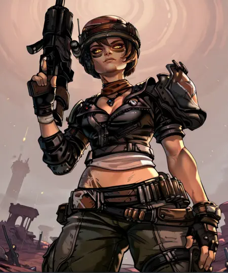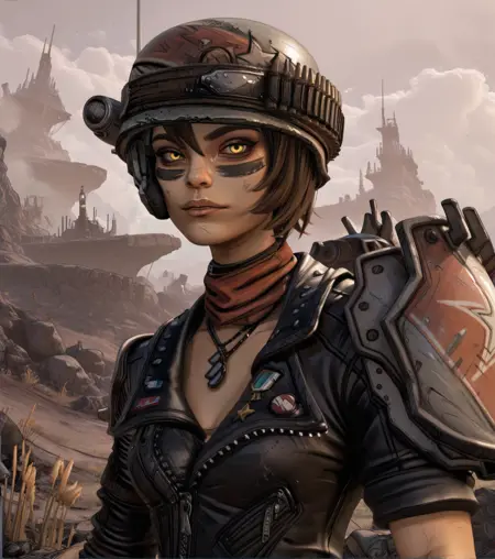 헬멧, 손가락 없는 장갑, 목걸이, 벨트, 어깨 보호장비, 스카프, 가죽 자켓, 복부 노출, 바지, 부츠, 가슴 노출,