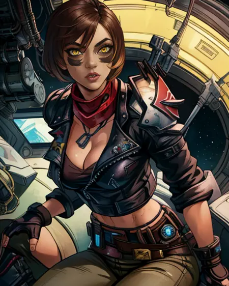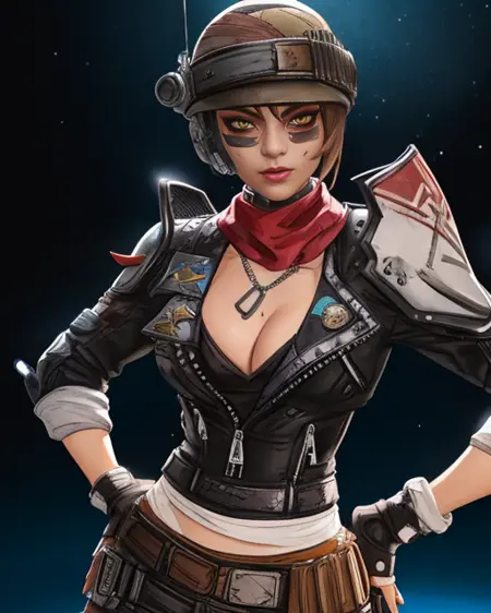 头盔、露指手套、项链、腰带、肩甲、围巾、皮夹克、露脐装、长裤、靴子、深V领,