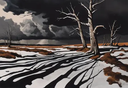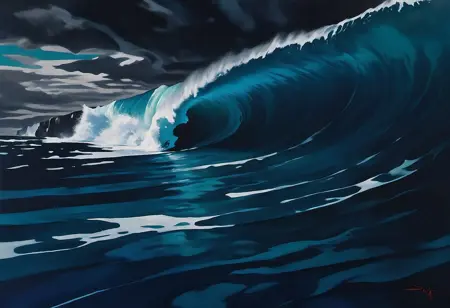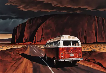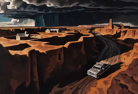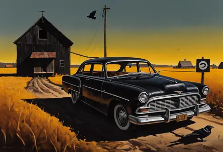 ZZ Wei 的画作以真实而高度抽象的方式描绘了锈蚀的汽车、废弃的建筑、道路与铁轨镶嵌于美国景观中的世界。强烈的光影营造出一种威胁感,延续了爱德华·霍珀(Edward Hopper)和安德鲁·怀斯(Andrew Wyeth)等画家作品中所传递的心理焦虑情绪。他的风格简洁,类似佐治亚·欧姬芙(Georgia O'Keeffe)。他的图像具有与乔治奥·德·基里科(Giorgio de Chirico)超现实场景同等的冲击力。总体而言,ZZ Wei 的主题传达了人与自然关系的模糊性——这种关系是一种斗争:人类在景观上留下印记,但自然最终以其压倒性的力量占据主导。这种本质的真实赋予了他的作品永恒的吸引力。