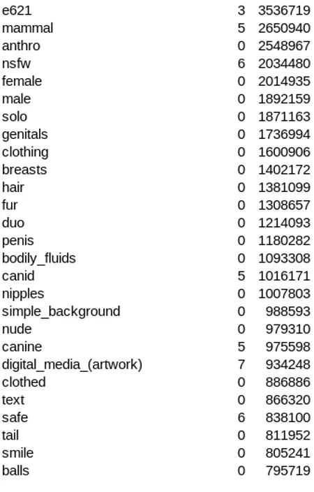 A: Due to continuing work on the datasets used for all the FluffyRock models, the counts and filtering of tags on this list can only be estimated via recreating the selection rules. When/if the datasets stabilize, and if I'm able to get a copy of the metadata without costing us an arseload in bandwidth, I'll datamine it for a more accurate component caption list.