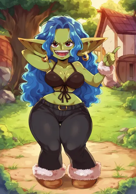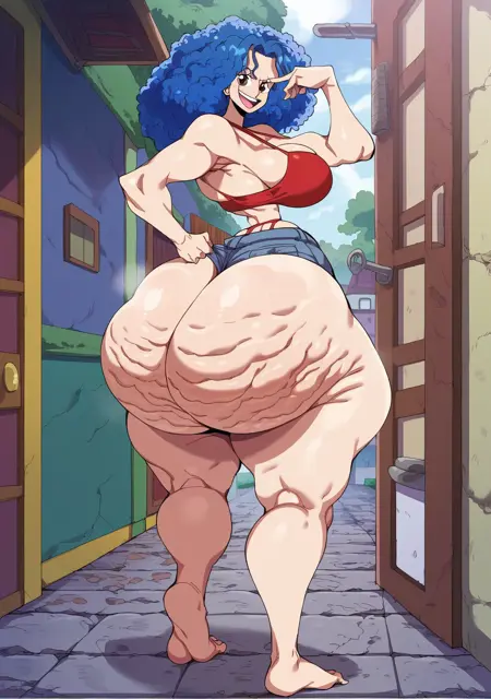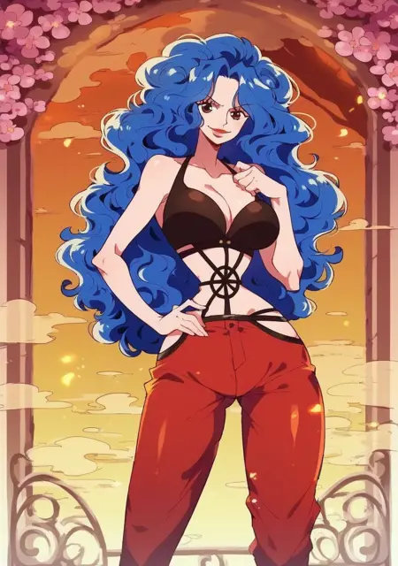 Prompts: miss doublefinger, one piece, slender, narrow waist, wide hips, large breasts, blue hair, bra, pants,