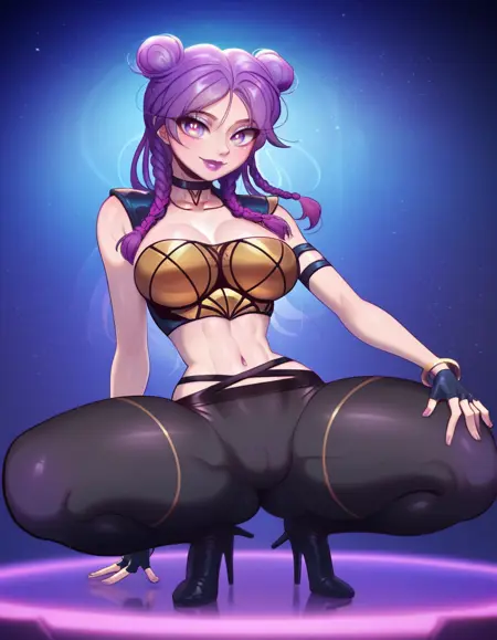 그녀의 얼굴용 태그: "보라색 머리카락, 보라색 입술, 둥근 머리묶음, 땋은 머리, 보라색 입술"