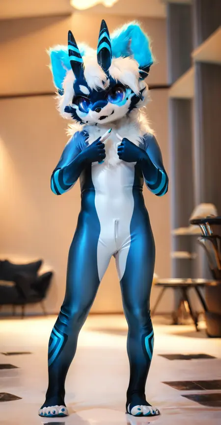触发词:lycra fur suit, furry, furry male/female, [颜色] and [颜色] fur, [颜色] and [颜色] bodysuit, paws, furry ears, horns(可选),