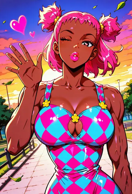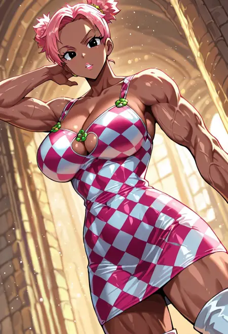 MissMondayOP、1girl、solo、暗い肌、暗い肌の女性、筋肉質な女性、ピンクの髪、短い髪、黒い目、二つのツインテール、唇、リップスティック、大きな胸、胸元、短いドレス、白いブーツ、二頭筋、肩出し、マゼンタと白のダイヤモンド模様のドレス、服の切り抜き、チェック柄の服、ジュエリー、太ももが太い、筋肉質な体、筋肉質な腕、筋肉質な脚