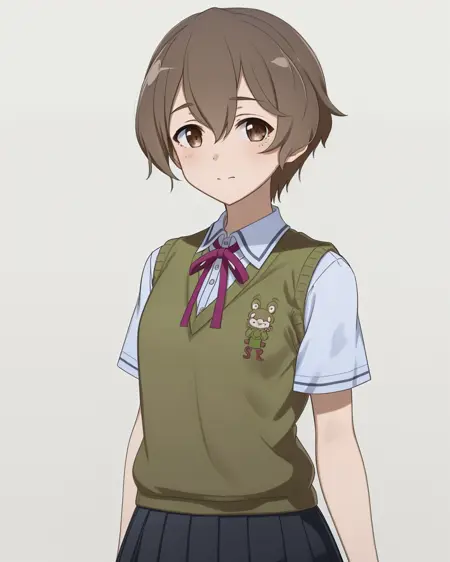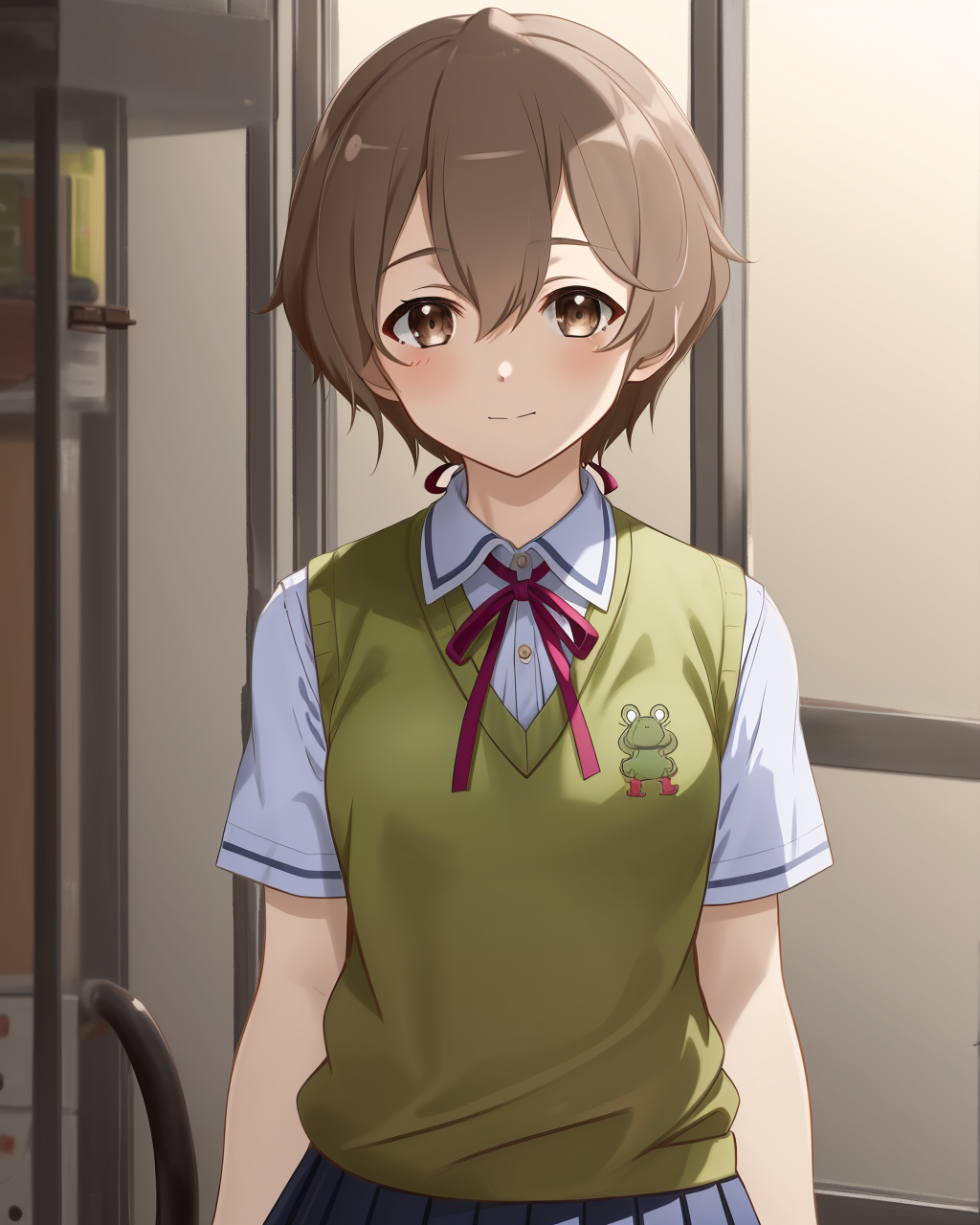 1girl, solo, short hair,brown hair, brown eyes,between eyes, school uniform,shirt,skirt,ribbon, pleated skirt, green sweater vest,neck ribbon,