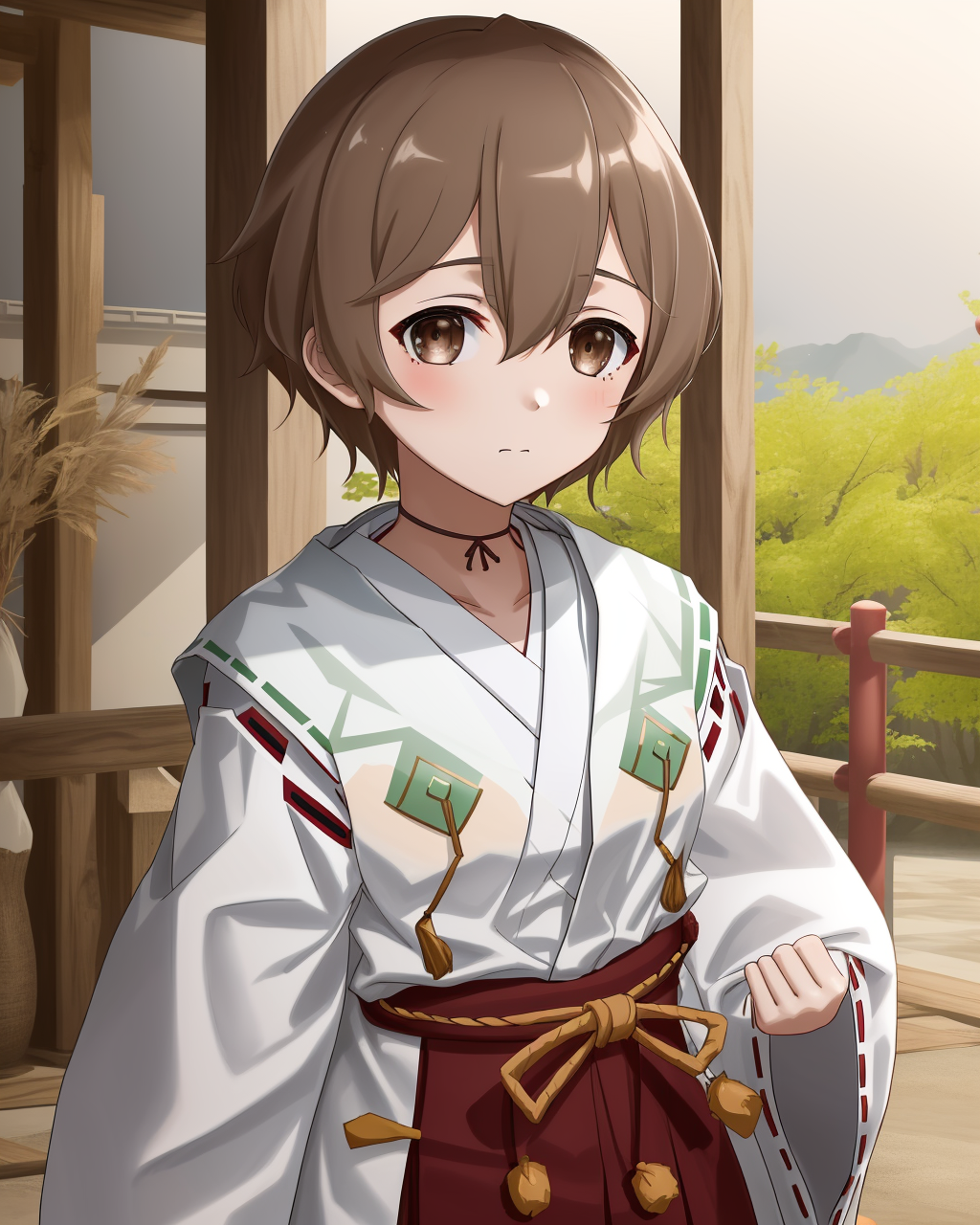 1girl, solo, short hair,brown hair, brown eyes,between eyes, long sleeves, japanese clothes,wide sleeves, kimono, sleeves past wrists,White hakama,miko,green stripes,tabi,