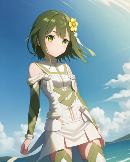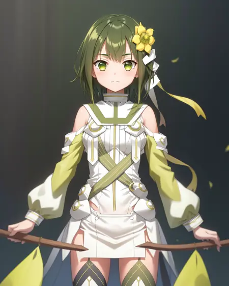 1girl, solo, short hair, green hair, hair ornament, dress, green eyes, green hair, hair flower, thighhighs,