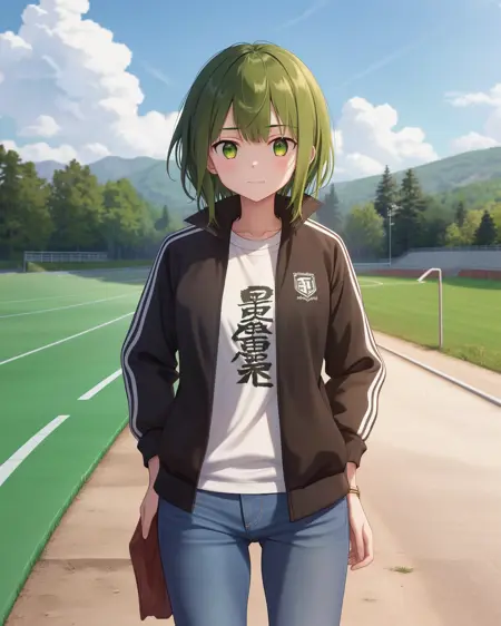 1girl, solo, short hair, green eyes, green hair, denim, clothes writing, jeans, white shirt, open clothes, green clothes, green track jacket,