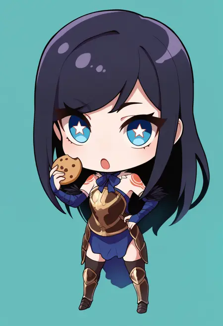 默认外观: shanCV,长发,黑发,蓝眼睛,蓝色裙子,露肩,纹身,蓝色领结,盔甲,胸甲,新娘手套,羽毛饰边,黑色过膝袜,护腿