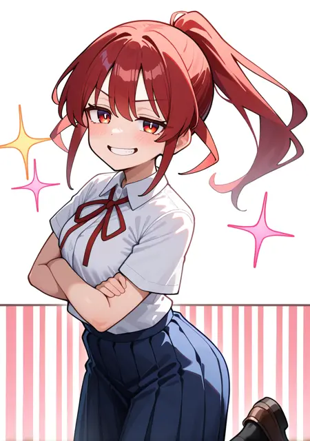"white shirt,collared shirt,short sleeves,blue skirt,pleated skirt, school uniform,red neck ribbon,black socks, loafers"