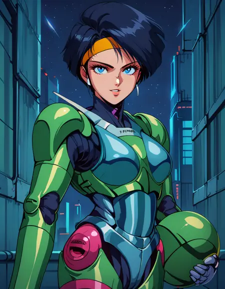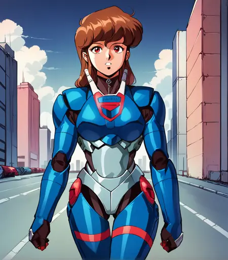 score_9, score_8_up, score_7_up, score_6_up, bubblegum-crisis+ prissa, prisssaber, blue power armor, mecha, retro artstyle, 1990s (style), 1girl, closeup , 1980s (style), solo, helmet, brown hair, armor, red eyes, upper body, no-helmet