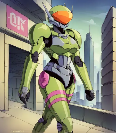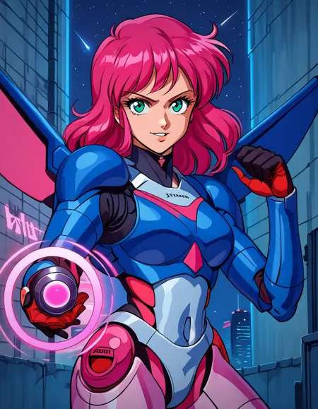score_9, score_8_up, score_7_up, score_6_up, bubblegum-crisis+, closeup++, bubblegum-crisis,nener, nenesaber+++, blue pink power armor, mecha, solo, 1girl, robot, cloud, sky, science fiction, day, mecha, flying++ in air