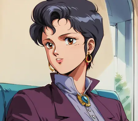 score_9, score_8_up, score_7_up, score_6_up, bubblegum-crisis+, closeup++, bubblegum-crisis, sylias++, syliabaseoutfit, short hair, jwellery, 1girl, retro artstyle, jewelry, earrings, solo, brown eyes, 1980s (style), black hair, 1990s (style), closeup++, sitting