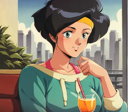 score_9, score_8_up, score_7_up, score_6_up, upper body ,solo, woman, nice eyes, posing++ ,retro , linnay, linnbaseoutfit, headband, 1girl, blue eyes, black hair, short hair, solo, retro artstyle, sitting, 1980s (style), drink , 1990s (style), sexy, high quality, femdom+, at city++
