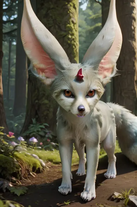 추가 프롬프트: white fur, large ears, forhead crytal, red crystal