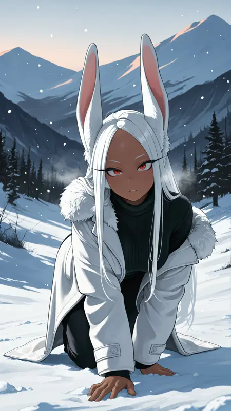 长发,白发,兔耳朵,动物耳朵,红眼睛,深色皮肤,长睫毛,白色紧身衣,无袖,高领,毛皮领,新月图案,身材匀称,紫色过膝袜,白色手套