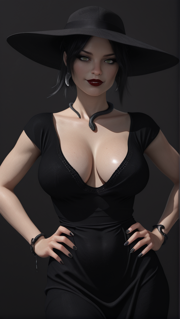 black dress, low-cut dress, snake necklace, snake bracelet,