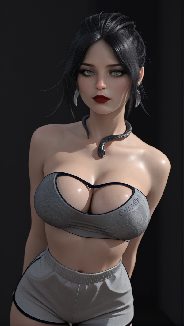 gray sports bra, strapless sports bra, gray sweat shorts, snake necklace, snake bracelet,