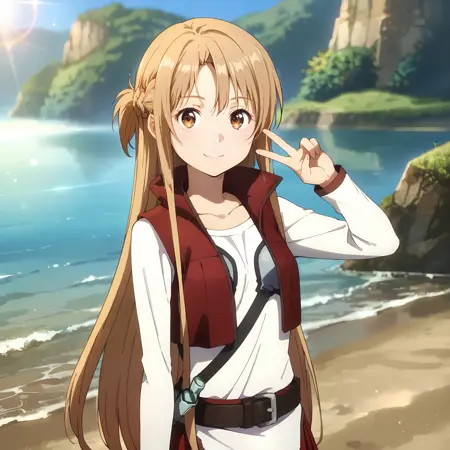 触发词:asopavp, asuna \(sao\), 棕色头发,长发,半扎辫子,棕色眼睛,白衬衫,长袖,短背心,红色敞开背心,未塞入的衬衫,棕色腰带,红色百褶裙,黑色连裤袜,红色靴子