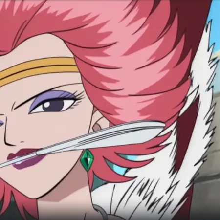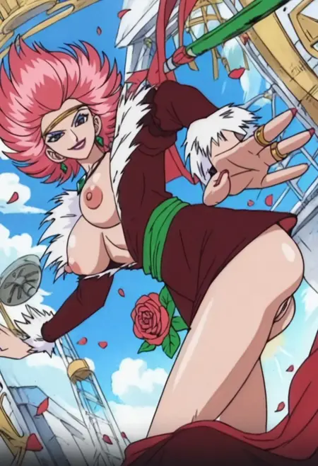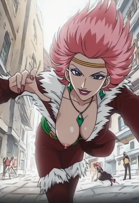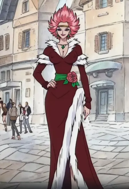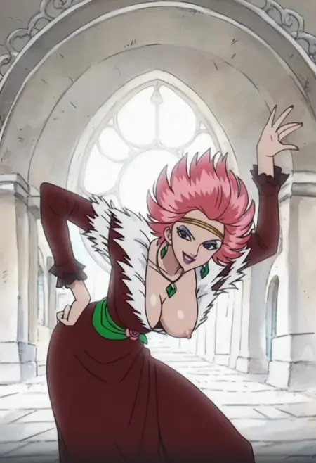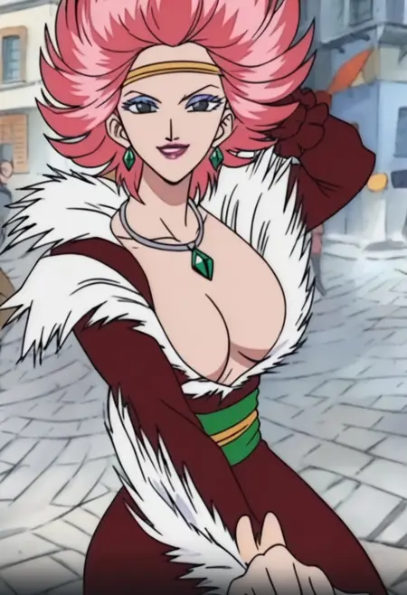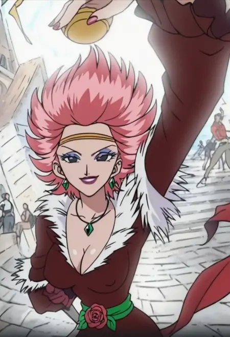 CarmenOP, 1girl, solo, fiery pink hair, black eyes, short hair, lips, lipstick, makeup, eye shadow, jewelry, necklace, earrings, gold headband, silver necklace with emerald, cleavage, large breast, flamenco dress, dark red dress, white frills, fur trim, green sash, belt, red rose on her hip, pink shoes, rings, nail polish, hand fan,