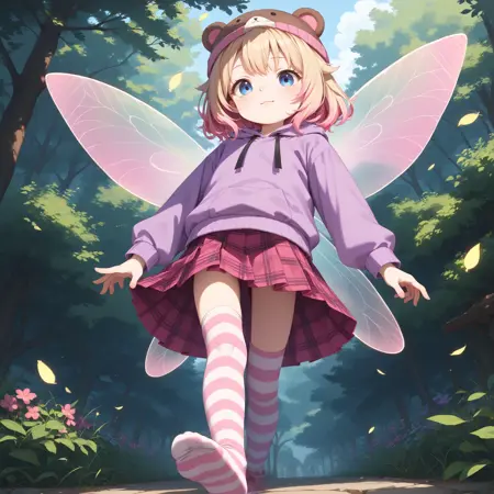skirt, purple hoodie, red skirt, pink thighhighs, striped legwear, pink legwear, teddy bear hat, bear ears, hat