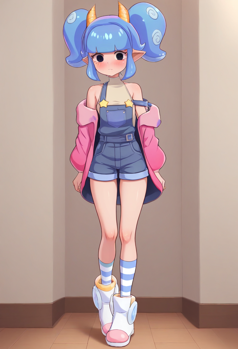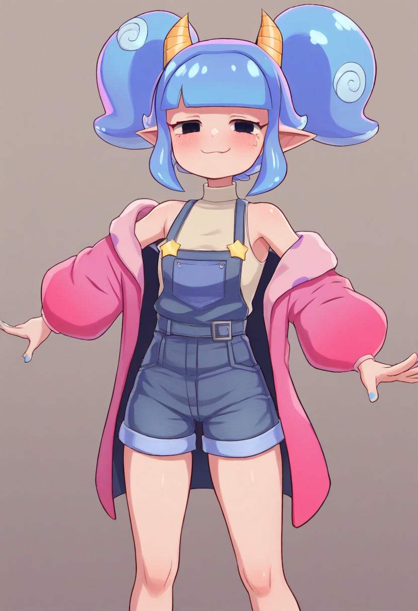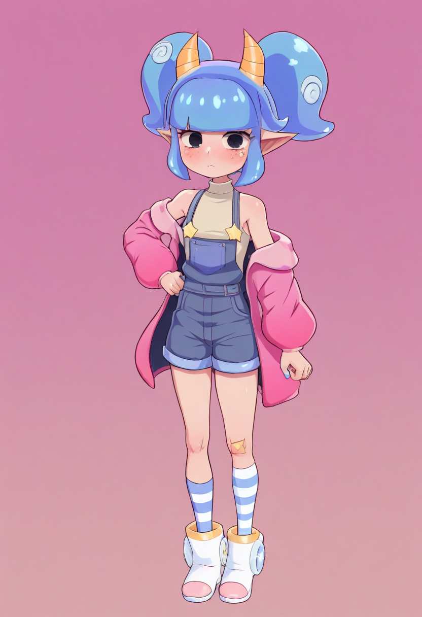 hackerling, twintails, blue hair, yellow horns, black eyes,