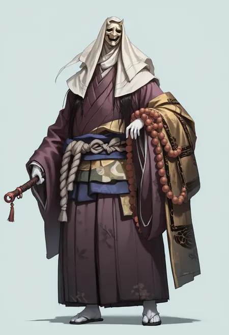 • 1girl, 面具, 珠子, 念珠, 和服, 斗篷, 刘萨(kesa), 黑发, 长发, 角, 面纱, 帽兜