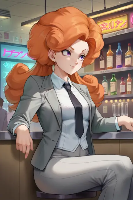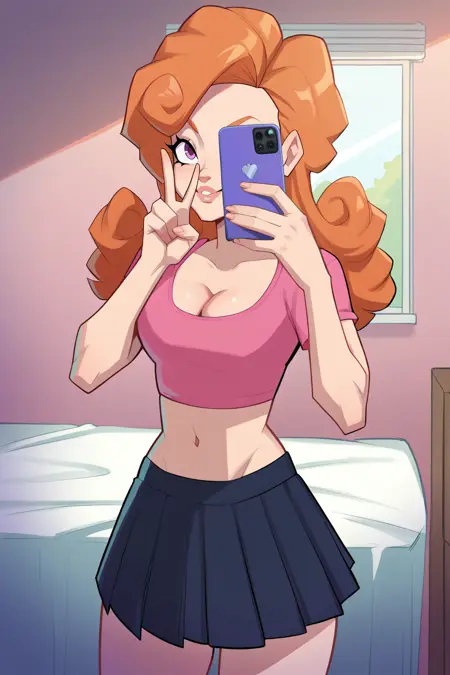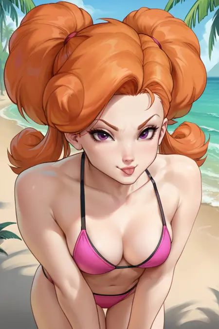 angela, 1girl, orange hair, purple eyes, long hair, curly hair