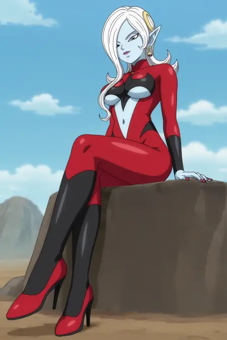 대체 복장, 투톤 바디슈트, 몸에 꼭 붙는, 검은 바디슈트, 중앙 개방부, 배꼽, 어깨 노출, 소매 없음, 분리된 소매, 검은 소매, 빨간 장갑, 투톤 스커트, 열린 스커트, 검은 스커트, 빨간 신발, 스틸레토 힐, 하이힐