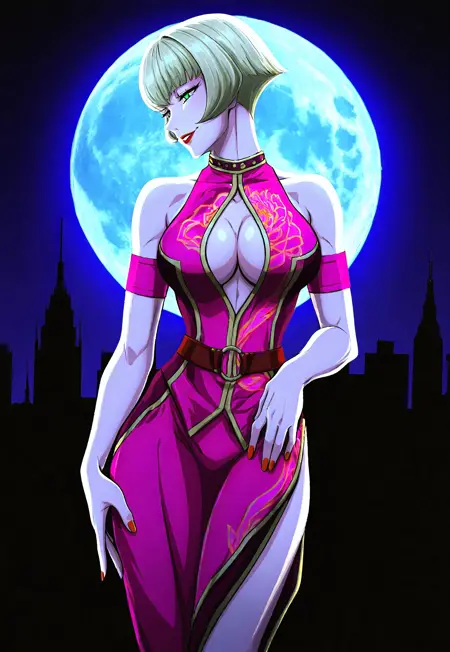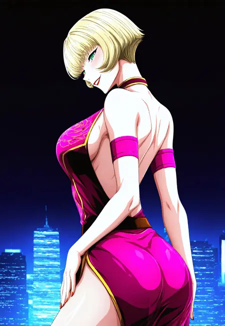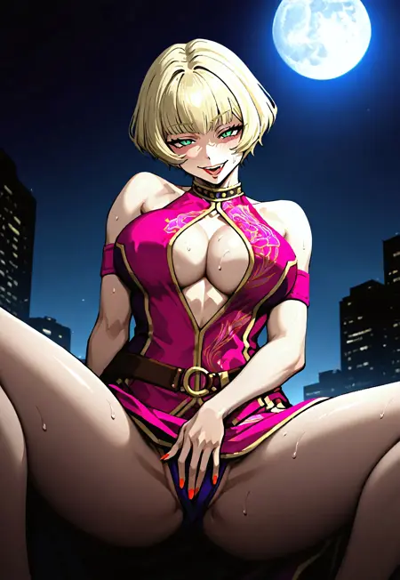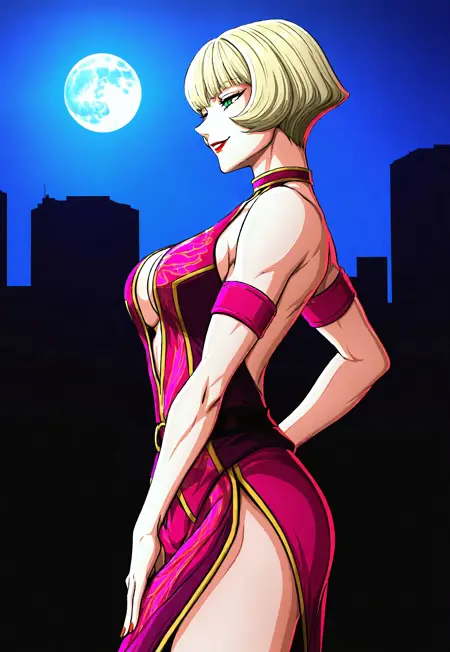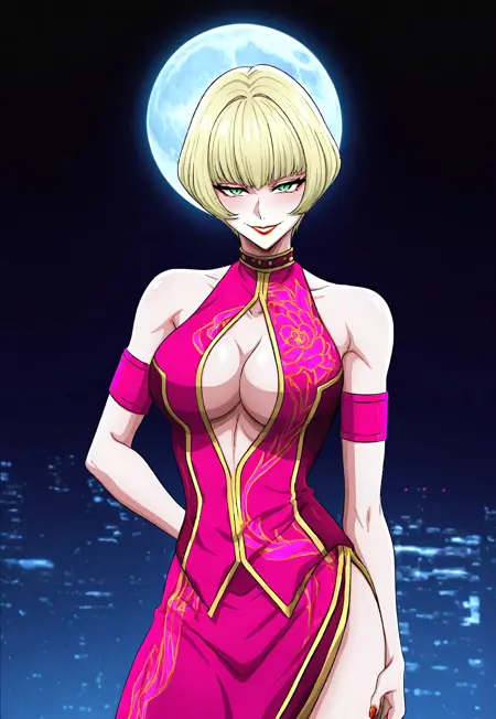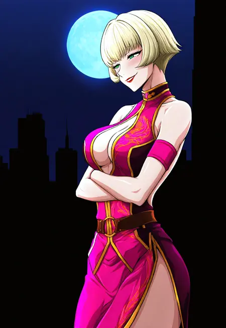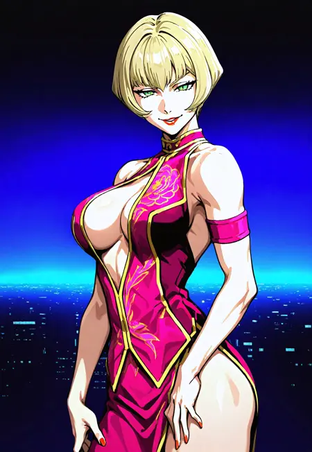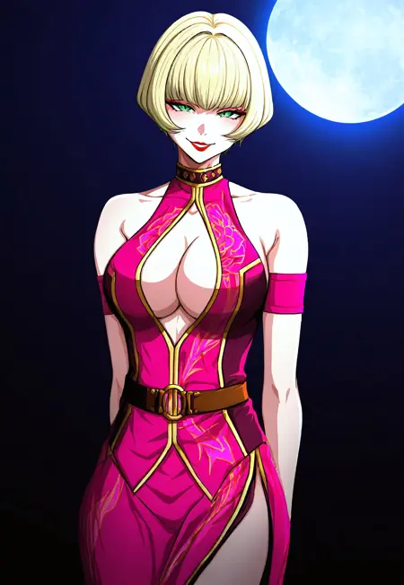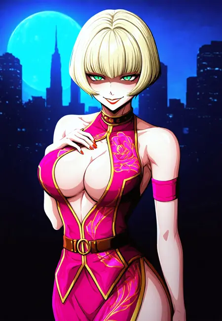 jenny burtory, jenny burtory \(bloody roar 3 china dress\), 1girl, solo, white skin, cleavage, large breasts, blonde hair, bob cut, green eyes, red lipstick, red nails, center opening, pink long china dress, backless outfit, side slit, bare shoulders, sideboob, pink armband, red belt, pink high heels