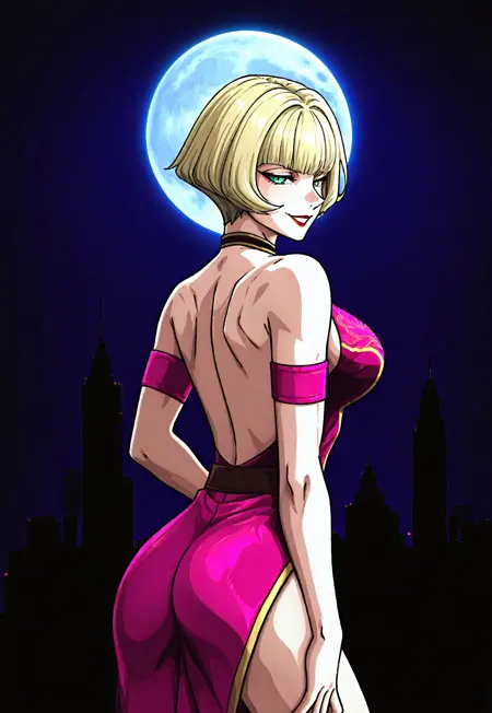 JennyBR3, 1girl, blonde bob cut, short hair, green eyes, red lipstick, red nails, no bra, middle breasts, slender, collarbone, cleavage, sexy, pink high heels, pink china dress, halter dress, side slit, bare shoulders, pink arm band, belt, backless outfit, center opening, purple panties