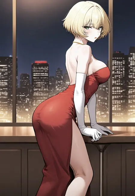 jenny burtory, jenny burtory \(bloody roar 2 V-jump strapless dress\), 1girl, solo, white skin, collarbone, cleavage, large breasts, blonde hair, bob cut, green eyes, red lipstick, white elbow gloves, gold necklace, red long strapless dress, backless outfit, side slit, red high heels