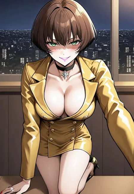 jenny burtory, jenny burtory \(bloody roar 2 leather blazer dress\), 1girl, solo, white skin, collarbone, cleavage, large breasts, dark brown hair, bob cut, green eyes, pale pink lipstick, sliver ring, red nails, black choker, gold leather blazer dress, ten gold buttons, dark gold strappy high heels