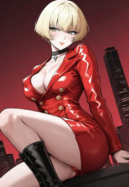 jenny burtory, jenny burtory \(bloody roar 2 leather blazer dress\), 1girl, solo, white skin, collarbone, cleavage, large breasts, blonde hair, bob cut, green eyes, red lipstick, sliver ring, red nails, black choker, red leather blazer dress, ten gold buttons, black knee high-heeled boots